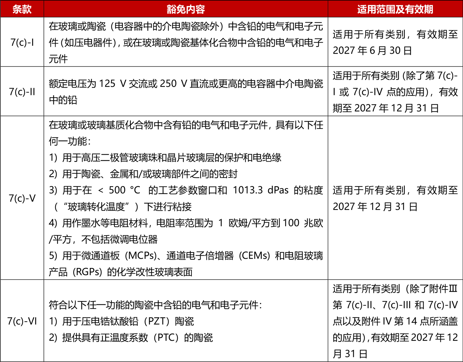 关于玻璃陶瓷电气电子元件,RoHS指令附录III的7(c)-I和7(c)-II豁免条款被替换,并新增7(c)-V和7(c)-VI豁免条款: