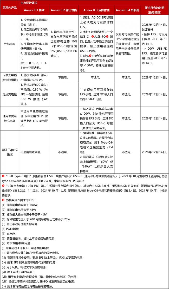 生态设计要求:EPS、无线充电器、无线充电板、通用便携式电池充电器和 USB Type-C 数据线应符合本法规附件二和附件三规定的生态设计要求。